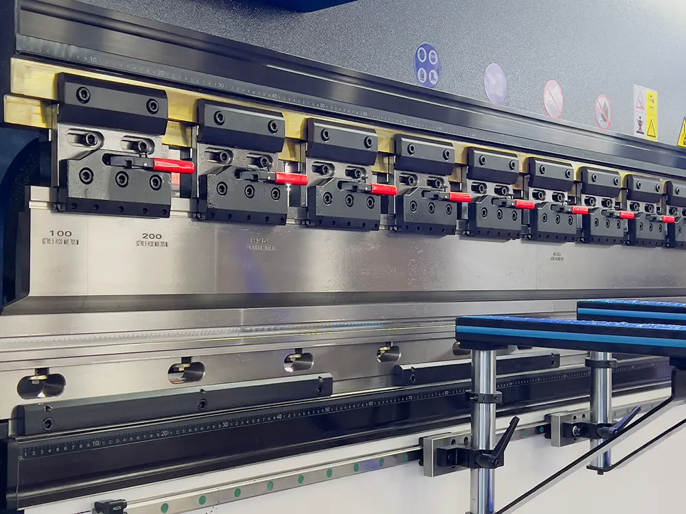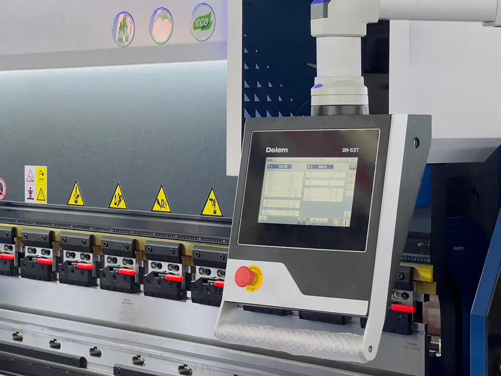 The electronic interface used to program and control the press brake. It manages parameters such as bend angle, backgauge position, and the number of bends.